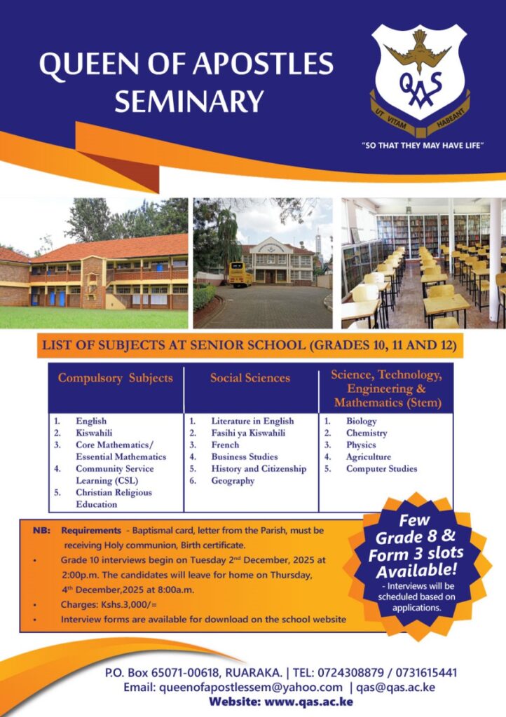 Queen of Apostles Seminary was started at Kabaa in 1926. It moved to Kilimambogo in 1946. It was moved back to Kabaa for two years in 1954, it was further moved from Kabaa to Kiserian in 1956 and lastly from Kiserian to this new site (Ruaraka) in 1967.